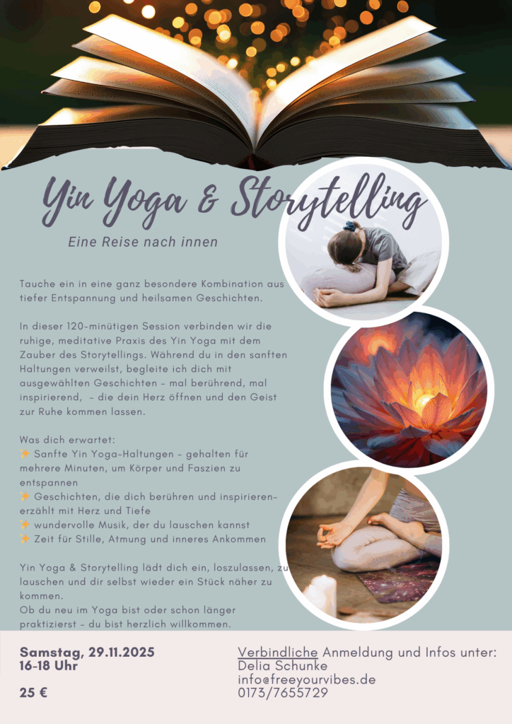 Während du in den gemütlichen Yin-Positionen ankommst, erzähle ich dir ausgewählte Geschichten – mal ruhig, mal inspirierend, immer mit Herz. Das Ganze begleitet von sanfter Musik und ganz viel Raum zum Durchatmen.